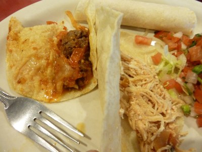 The next and final stop for National Taco Day was Mexico Lindo, around the corner from Tacos El Guero, where Scott ordered cabrito, gamey but with happy rivulets of fat. stuck with the tacos, presented in handmade corn tortillas. The pillowy wrapping nestled guiso de res stuffed with fresh tomatoes and onion stained orange from the stew. The chicken taco was a spider’s nest of unfinishable detritus.