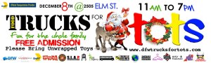 DFW Truck for Tots — On Saturday December 8, 2012 from 11:00 a.m.–7:00 p.m., 25 Dallas and Fort Worth food trucks are gathering at the corner of Elm Street and Gaston Avenue in Deep Ellum (2505 Elm Street, Dallas, TX) for a massive toy drive for the Dallas-Fort Worth Chapter of Toys for Tots. More than 20 United States Marines will be on hand to take toy donations and guests are encouraged to bring a new, unwrapped toy for a needy child. Pictures with Santa will be available in addition to live music, bounce houses and more than 50 vendors for holiday shopping.